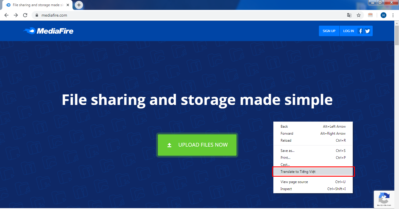 + Vào website: https://www.mediafire.com/. Bạn có thể chuyển sang tiếng Việt để sử dụng bằng cách Nháy chuột phải và chọn Translate to Tiếng Việt
