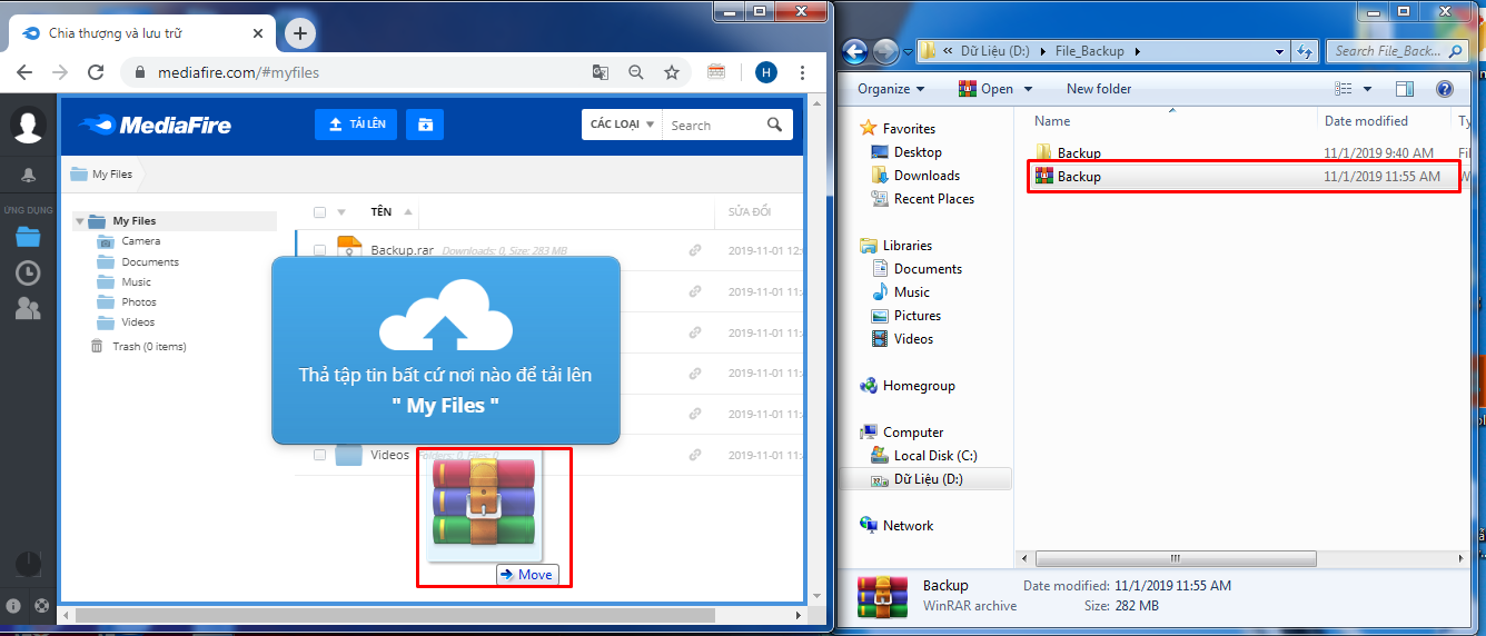 - Thu nhỏ 2 thư mục web và thư mục files dữ liệu. Kéo files dữ liệu cần tải lên Mediafire sang thư mục wed (đã thu nhỏ) và thả ở thư mục web đã mở sẵn.