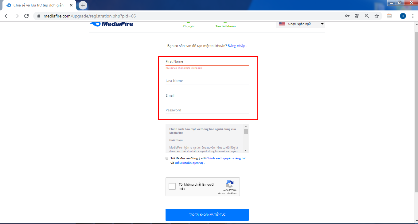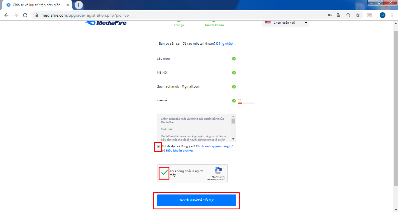 + Khi nhập xong các thông tin để đăng ký tích vào ô Tôi đã đọc và đồng ý với các chính sách quyền riêng tư và điều khoản dịch vụ - Click Tạo tài khoản và tiếp tục