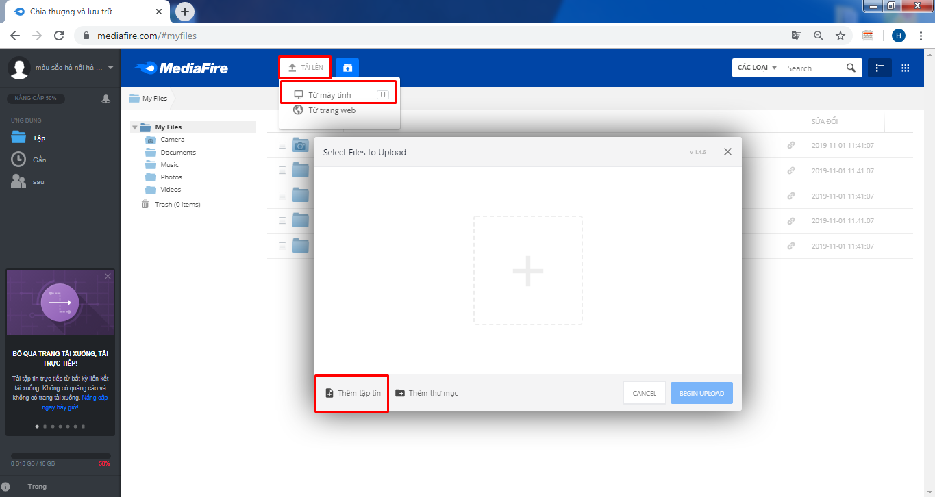 - Đăng nhập vào Mediafire - click Tải lên - Từ máy tính - Thêm tập tin