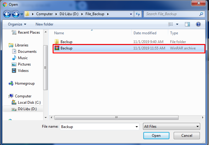 - Chọn files dữ liệu mà bạn cần tải lên( Nén files lại cho dung lượng nhỏ dễ dàng tải lên, nếu chưa biết thì xem ở đây https://sanketoan.vn/phan-mem-mien-phi/kho-tai-lieu) - Click Open